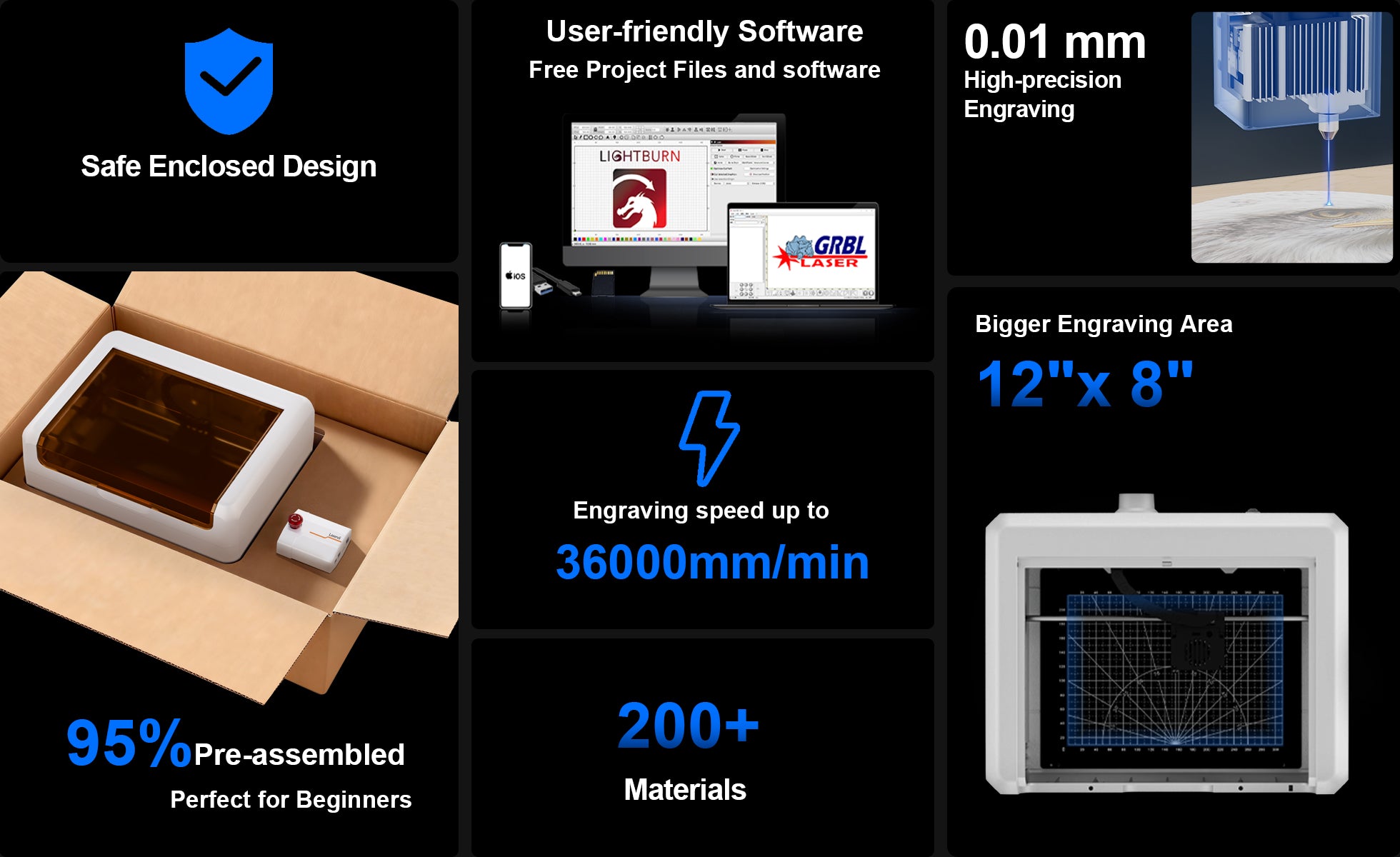Dzięki prędkościom grawerowania sięgającym nawet 36000 mm/min, zarówno produkcja masowa, jak i projekty osobiste mogą być realizowane bez długiego oczekiwania. Przewyższając standardowe grawery biurkowe o ponad 150%, skraca zadania, które kiedyś zajmowały godziny, do zaledwie kilku minut, zapewniając ogromny skok w Twojej wydajności.