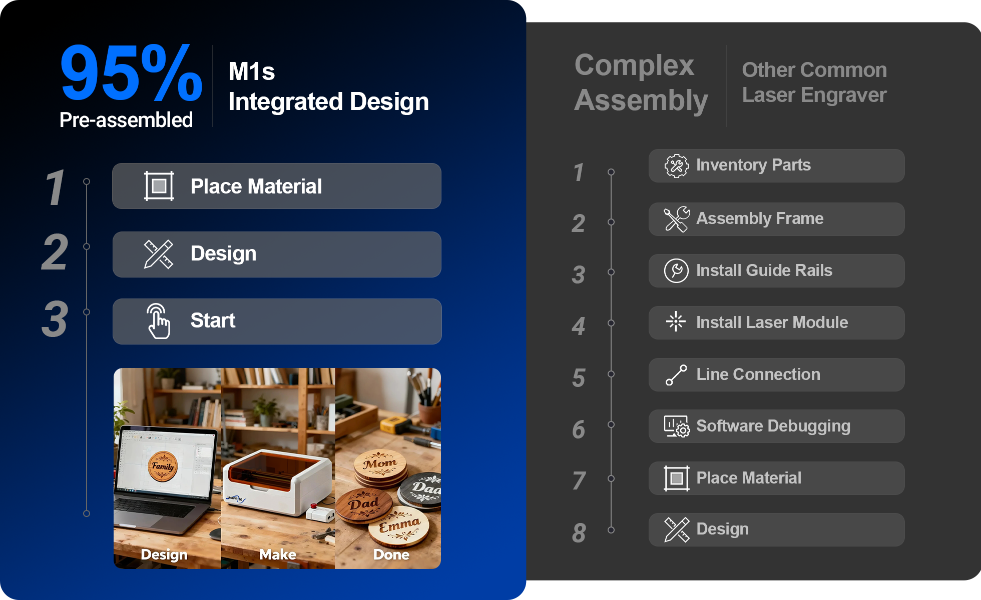 Ten laser o mocy 12W zapewnia silne działanie, umożliwiając czystsze i bardziej precyzyjne cięcie drewna z znacznie mniejszą karbonizacją niż inne lasery. Obsługuje skomplikowane grawerowanie złożonych wzorów i tekstu, odpowiednie dla różnych materiałów i branż. Niezależnie od tego, czy tnie drewno o grubości 8 mm, papier kraftowy, skórę czy precyzyjne metale, M1s radzi sobie z tym bez wysiłku.